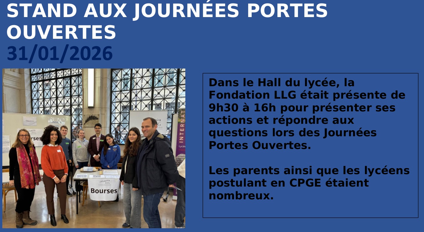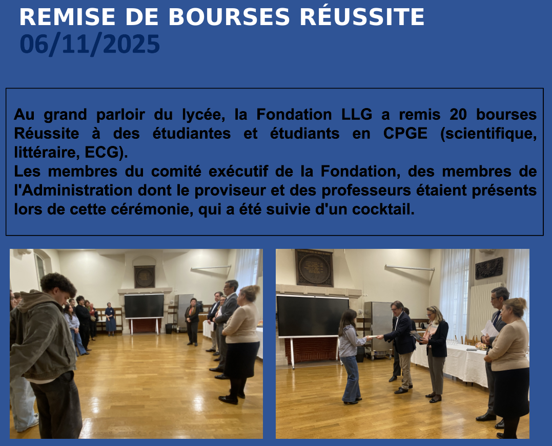 “ Madame, Petit message pour vous dire que je serai à Ulm au département Physique à la rentrée. Je tenais à vous remercier pour votre bienveillance. Vos multiples aides ont permis de m’enlever un poids conséquent et pour cela je vous suis extrêmement reconnaissant. Encore une fois merci pour tout. Je vous souhaite une bonne continuation. Et j’espère que la fondation LLG continuera d’aider des élèves pour que — comme moi — ils atteignent leur rêve . MERCI. Merci mille fois. ”